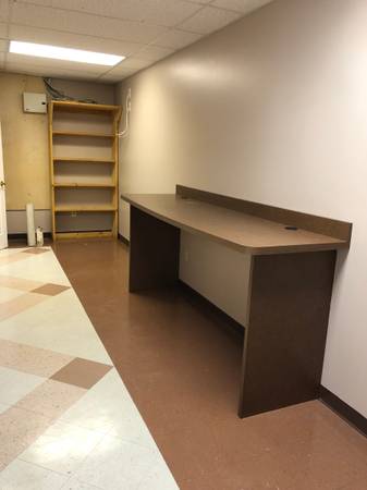 The newly painted unit has one large office area divided by a counter. There is a separate storage area in the back portion with two doors leading into it. A separate bathroom is within.